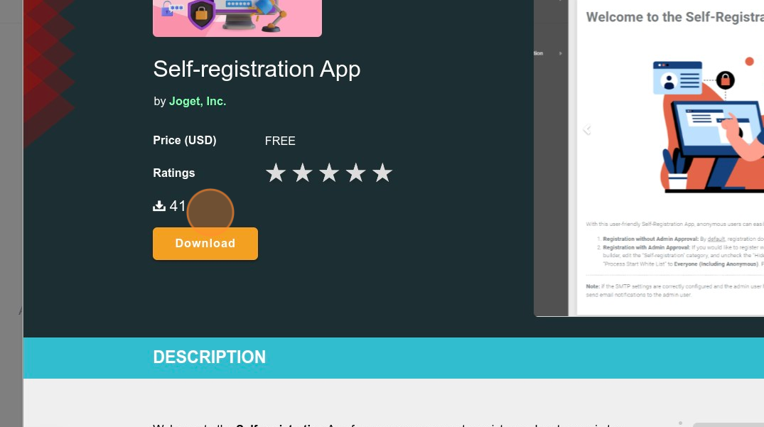 En la página de la aplicación, encontrarás las calificaciones de la aplicación, el precio, imágenes de su interfaz y una interfaz completa. Para integrar la aplicación en tu instancia de Joget, haz clic en Descargar.