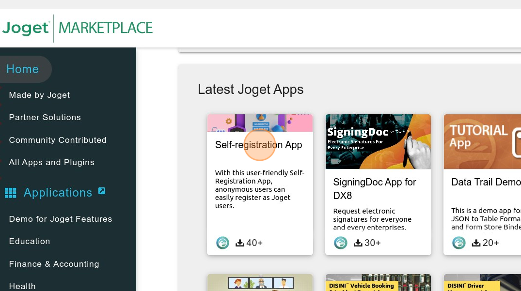 No necesitas una cuenta en el Mercado Joget para acceder a él. Sin embargo, deberás registrarte para obtener una cuenta por separado en el Mercado Joget para poder descargar e instalar aplicaciones.
